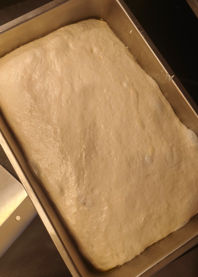 - Nach 2h wird der Teig in eine geölte Schüssel geben und über Nacht abgedeckt. in den Kühlschrank gestellt
