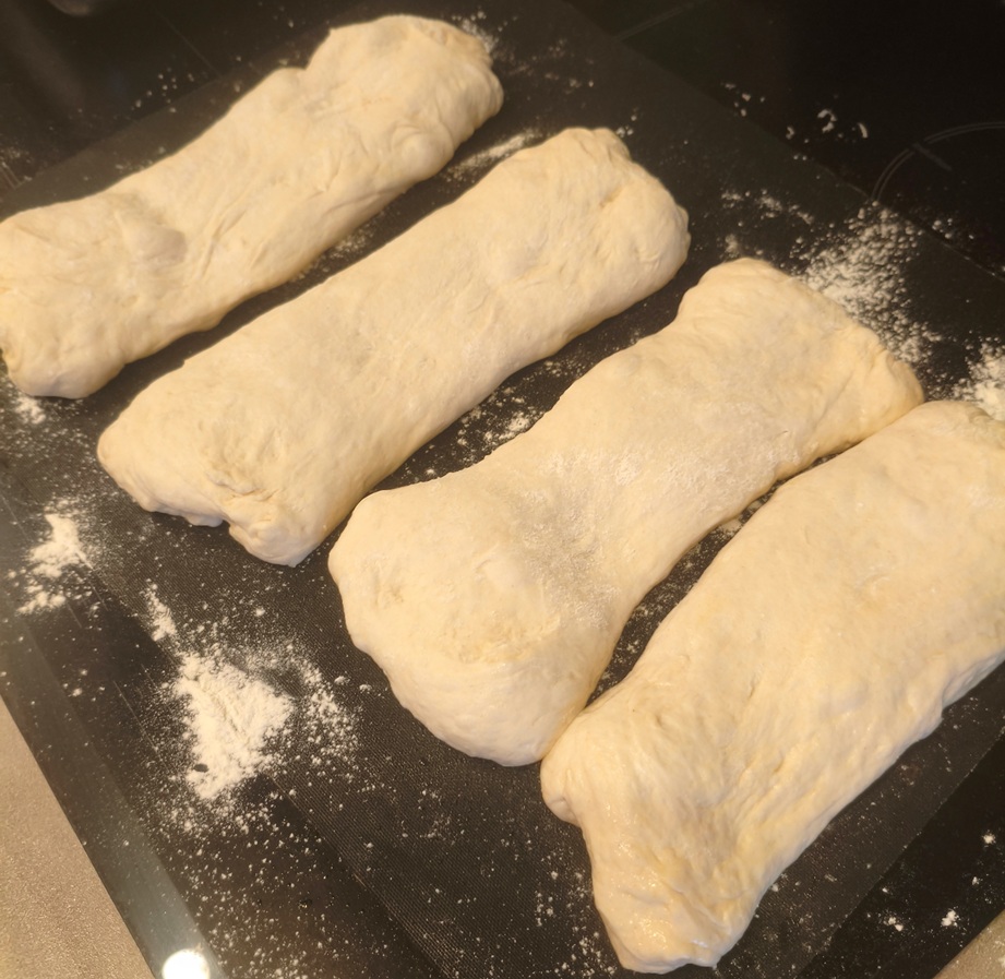 - Der Teig wird auf eine bemehlte Fläche gekippt und dann möglichst ohne Luftblasen zu zerstören in 4 Brote geteilt. Die legt man dann schon mal auf eine Backfolie und lässt es abgedeckt nochmal 30 min gehen.