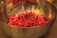 - Das Fleisch wird in kleine Stücke geschnitten und dann gewolft. Man sollte immer sicher sein, dass keine Sehnen am Fleisch sind.