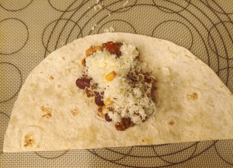 • Auf eine Hälfte in der Mitte werden 2 EL der Füllung gegeben und etwas Käse.
