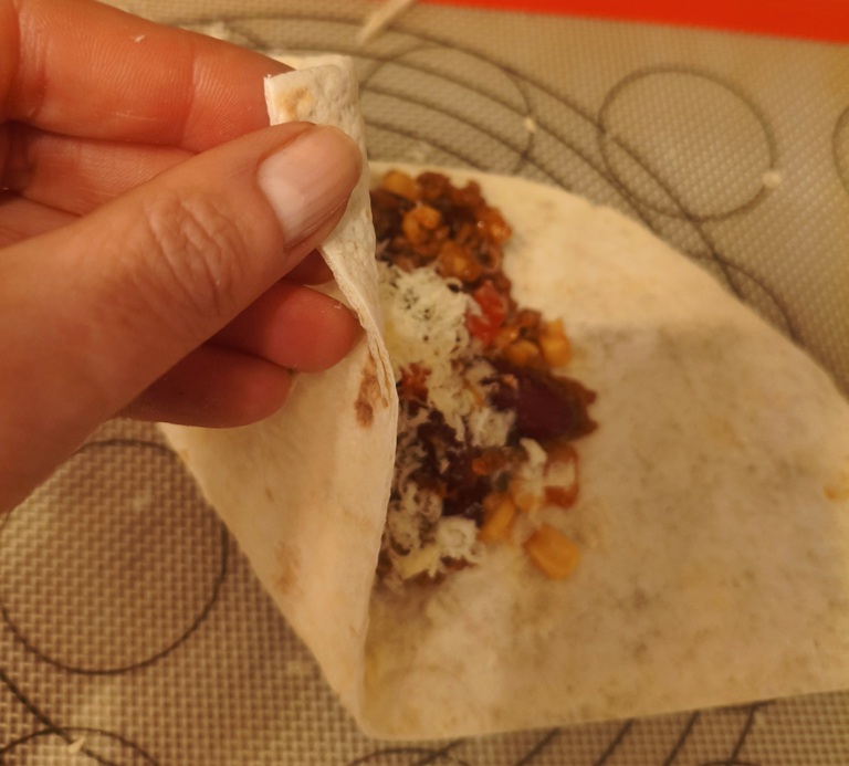 • Dann werden die Seiten so umgeklappt das ein Dreieck entsteht. Auf die obere Öffnung wird mit einem Pinsel Joghurt gepinselt, so dass man die Tortilla hier zukleben kann.