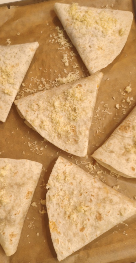 • Die Dreiecke werden auf ein Backblech gelegt. Wir streuen noch Käse oben drauf.